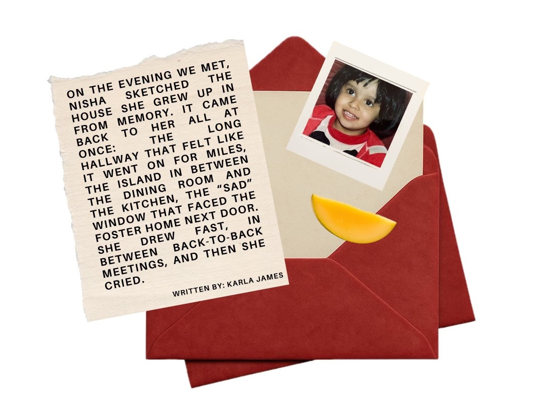 Nisha is an Indian-American architect and educator, a woman who thinks in floor plans and feelings at the same time. Her work sits at the intersection of care and geometry: what it means to make a life inside four walls when you have known loss, migration, and being told “that’s not for girls like you.” The house she remembers most clearly is not the largest or the most beautiful, but the one where seven people tried to build a life inside a modest upstairs unit of a two-family home in Bayside, Queens.